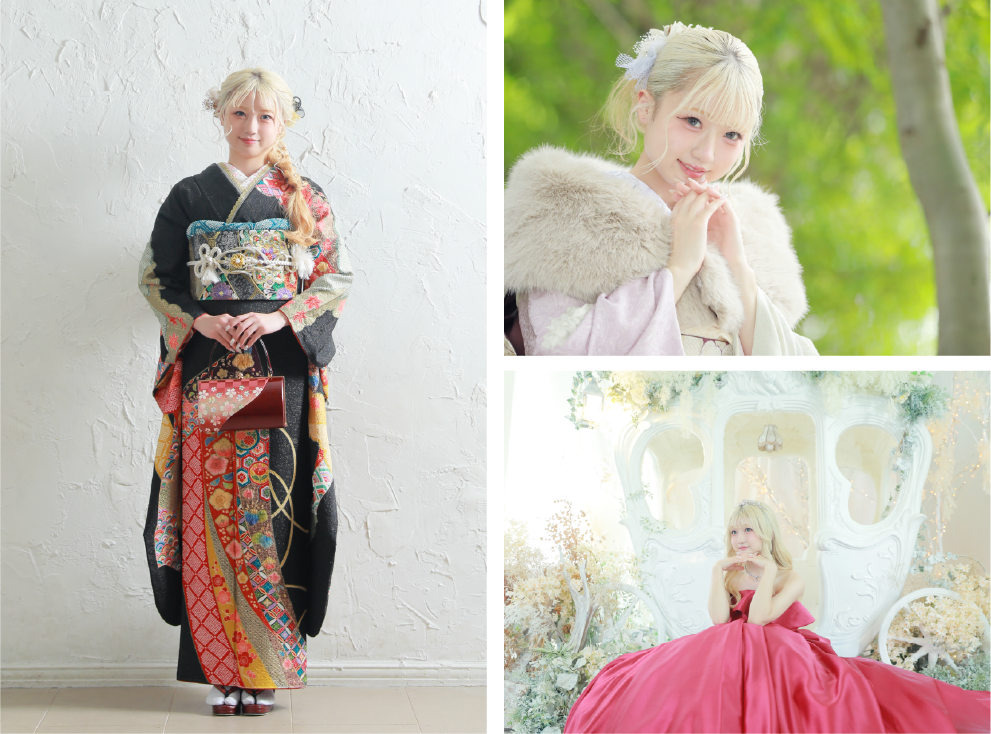 すでにお衣装はご用意されている方に当店でお支度・撮影をしていただけるプランです。衣装はお客様のものを利用いたします。 ※お持ち込みプランは成人式当日のお支度はお受けできません。