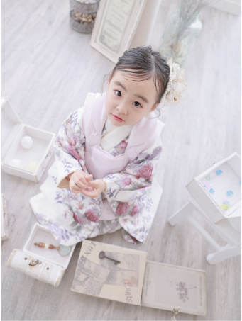 お着物は、お子様の腕の長さに合わせ、1着1着肩上げをし、ご準備させていただいております。また、お子様に合わせ、着付けの仕方や柄の見え方などを工夫して、なるべく苦しくないよう楽しくお着物撮影できるようにお着付けさせていただいております。