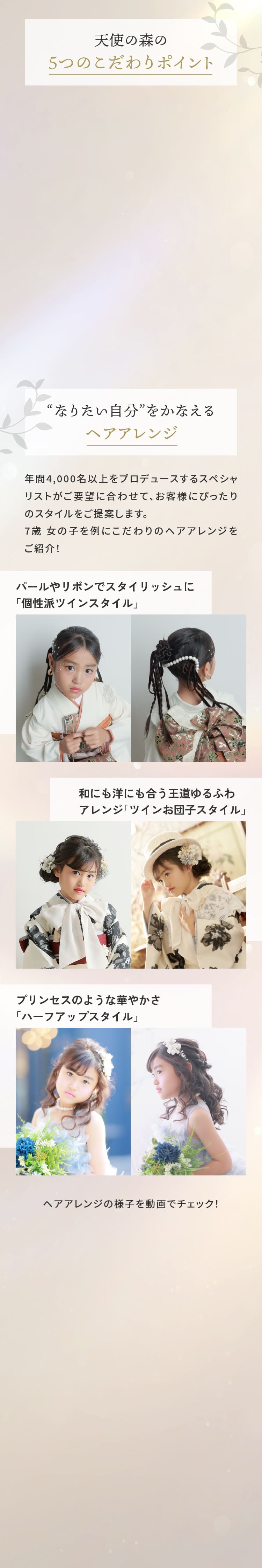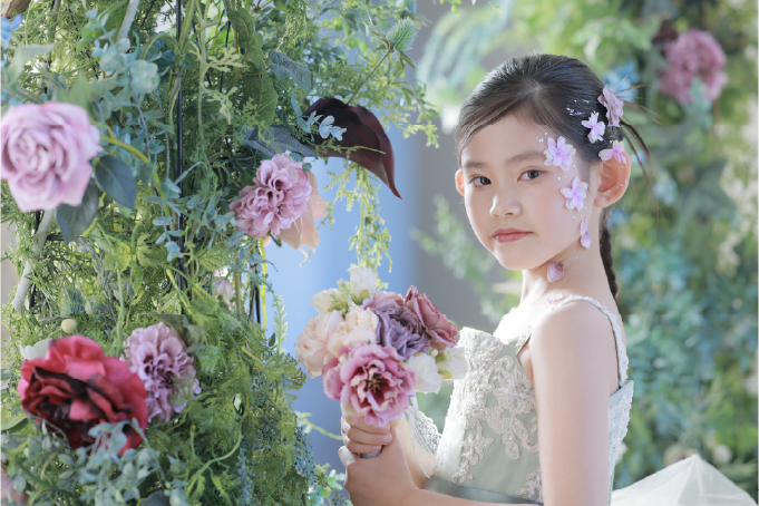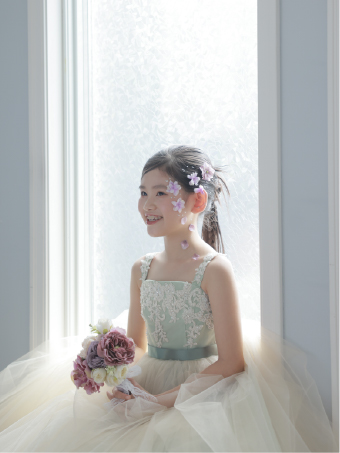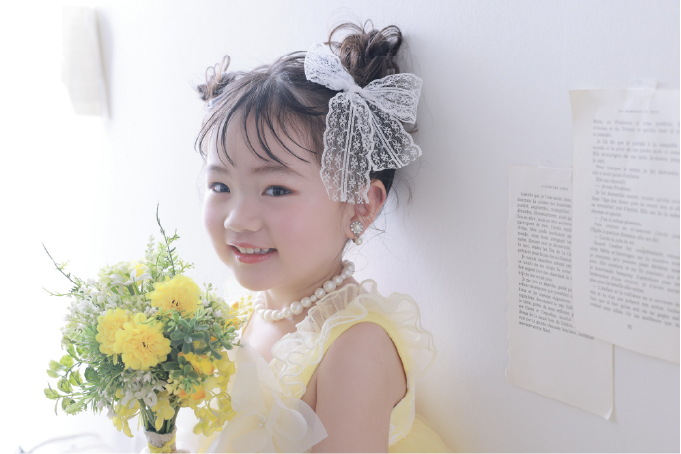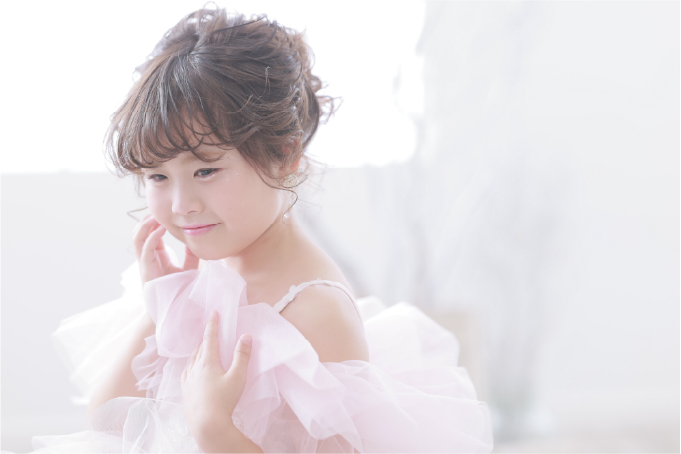 お好みのヘアメイクのご希望もOK!まとめ髪からふんわりとしたルーズスタイルまで。幅広いお子様の「なりたい」を実現します。また、衣装ごとにヘアスタイルを変えて、違う雰囲気にすることもできます。