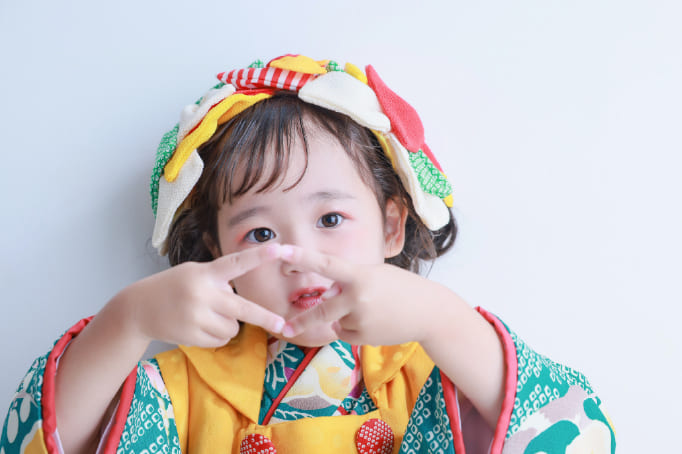 お着物は、お子様の腕の長さに合わせ、1着1着肩上げをし、ご準備させていただいております。また、お子様に合わせ、着付けの仕方や柄の見え方などを工夫して、なるべく苦しくないよう楽しくお着物撮影できるようにお着付けさせていただいております。
