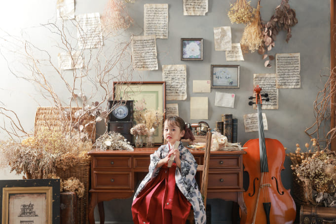 撮影は、お子様の雰囲気に合わせて背景や小物などを合わせております。事前にご要望等ある場合にはお伺いをし、お客様の思い描く七五三の想い出になるようにお手伝いさせていただきます。
