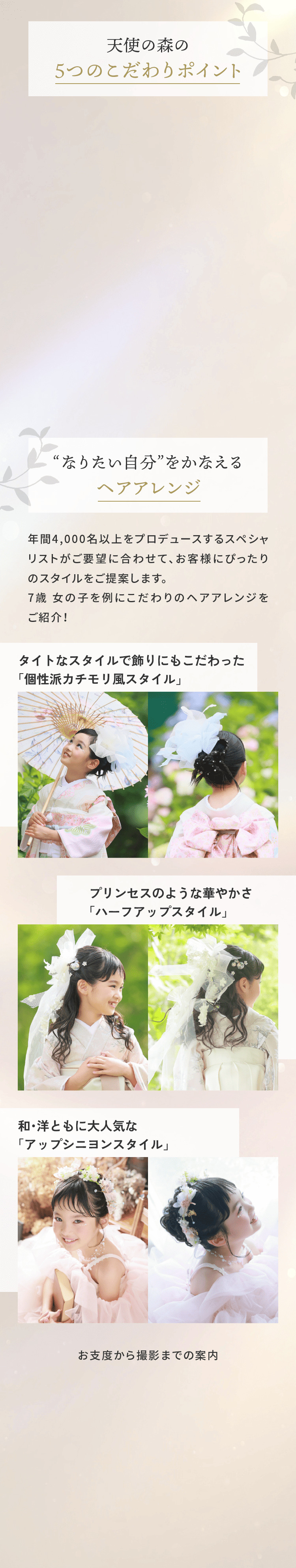 お好みのヘアメイクのご希望もOK!まとめ髪からふんわりとしたルーズスタイルまで。幅広いお子様の「なりたい」を実現します。また、衣装ごとにヘアスタイルを変えて、違う雰囲気にすることもできます。