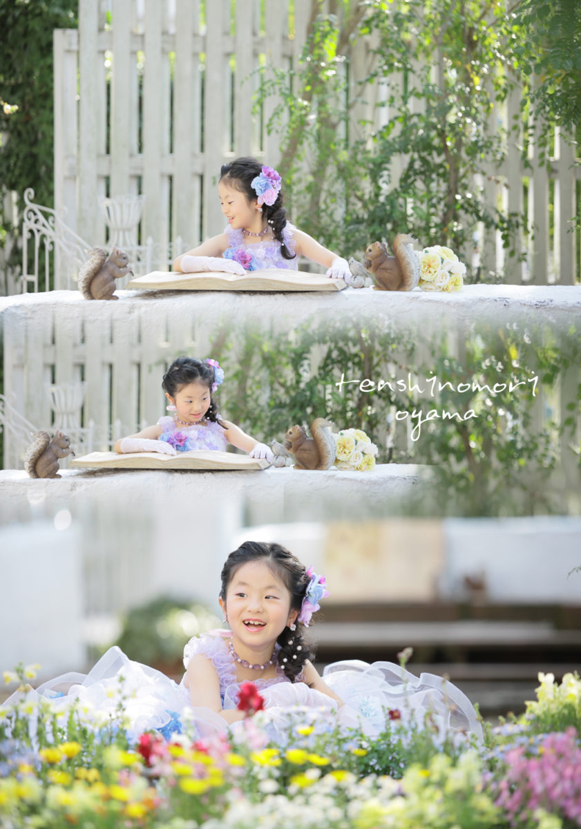 こちらは七五三撮影でのシーン ドレス衣裳で 森の動物たちに絵本を読んであげています♪