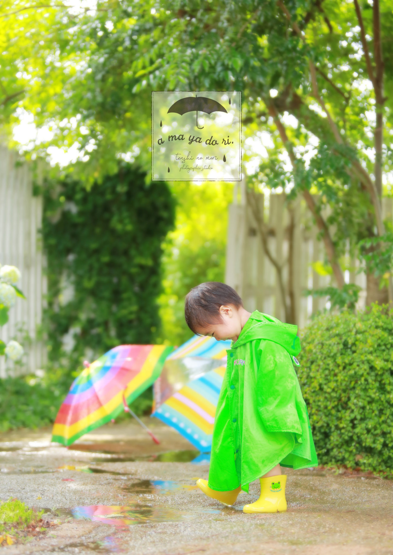【内容】 レインポンチョ・長靴・傘で雨の中のお散歩風景撮影(晴れの日はシャワーで雨を降らします☂)
