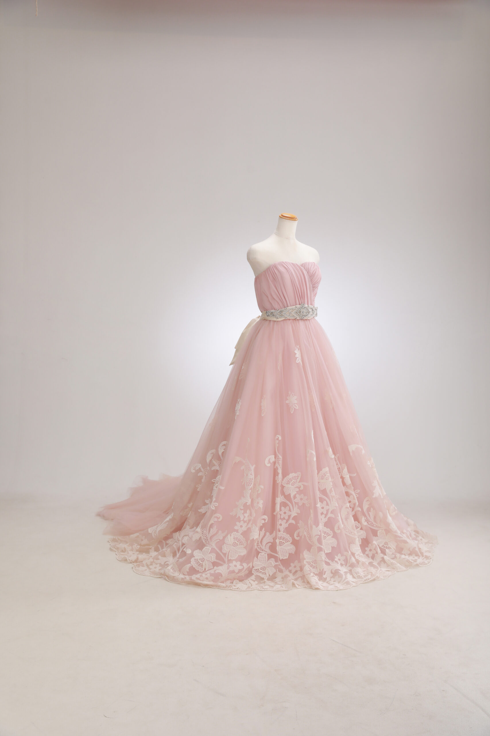 今人気のくすみカラー。淡いピンクと裾にかけてのレースがとても可愛らしいです!