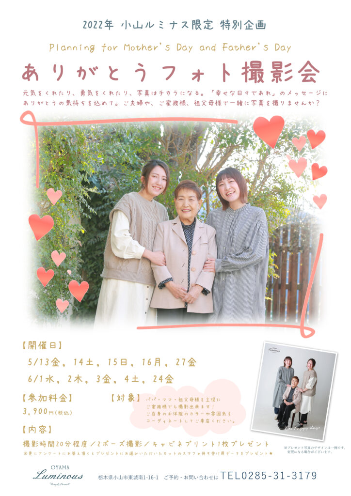 母の日&父の日特別企画「ありがとうフォト撮影会」~「ありがとう」をテーマに 写真で元気に 家族の幸せな日々を願って~