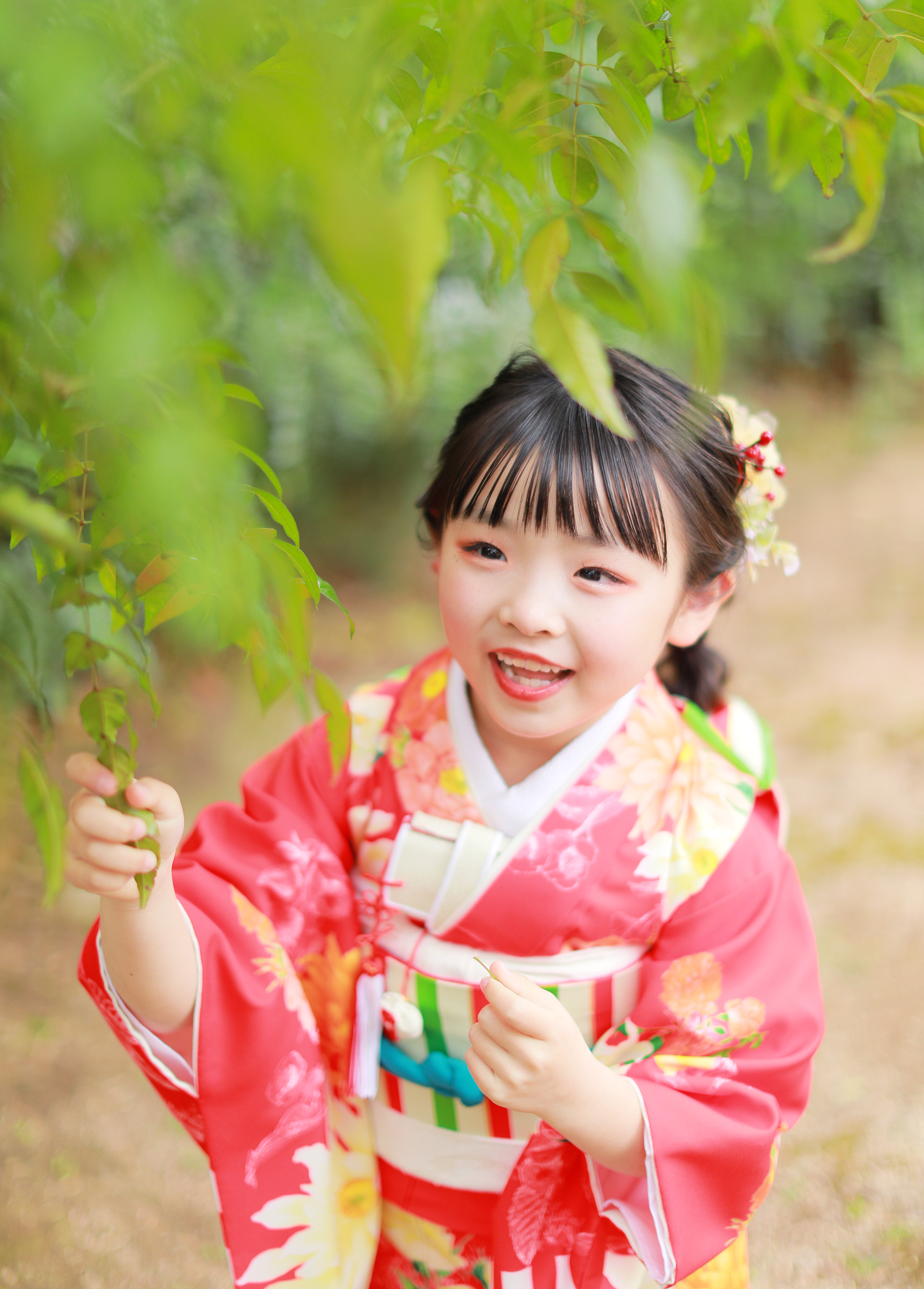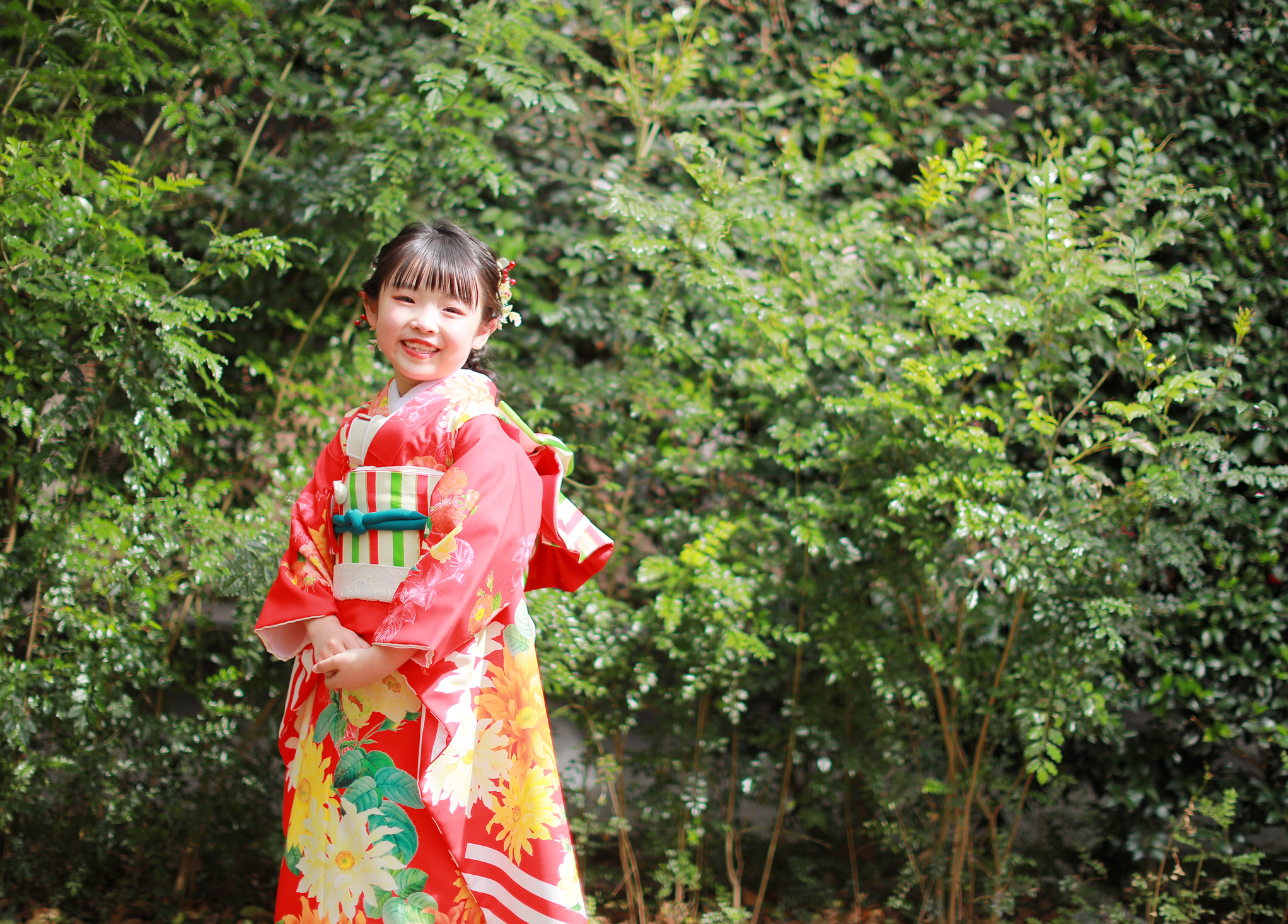 お庭での撮影ですとよりお着物の鮮やかさが引き立ちます👀