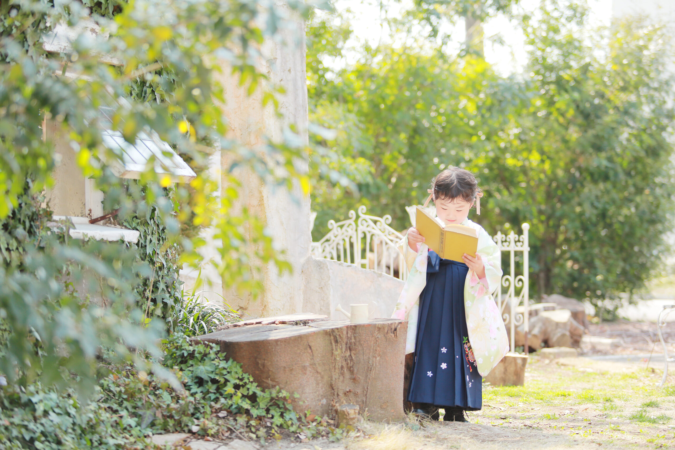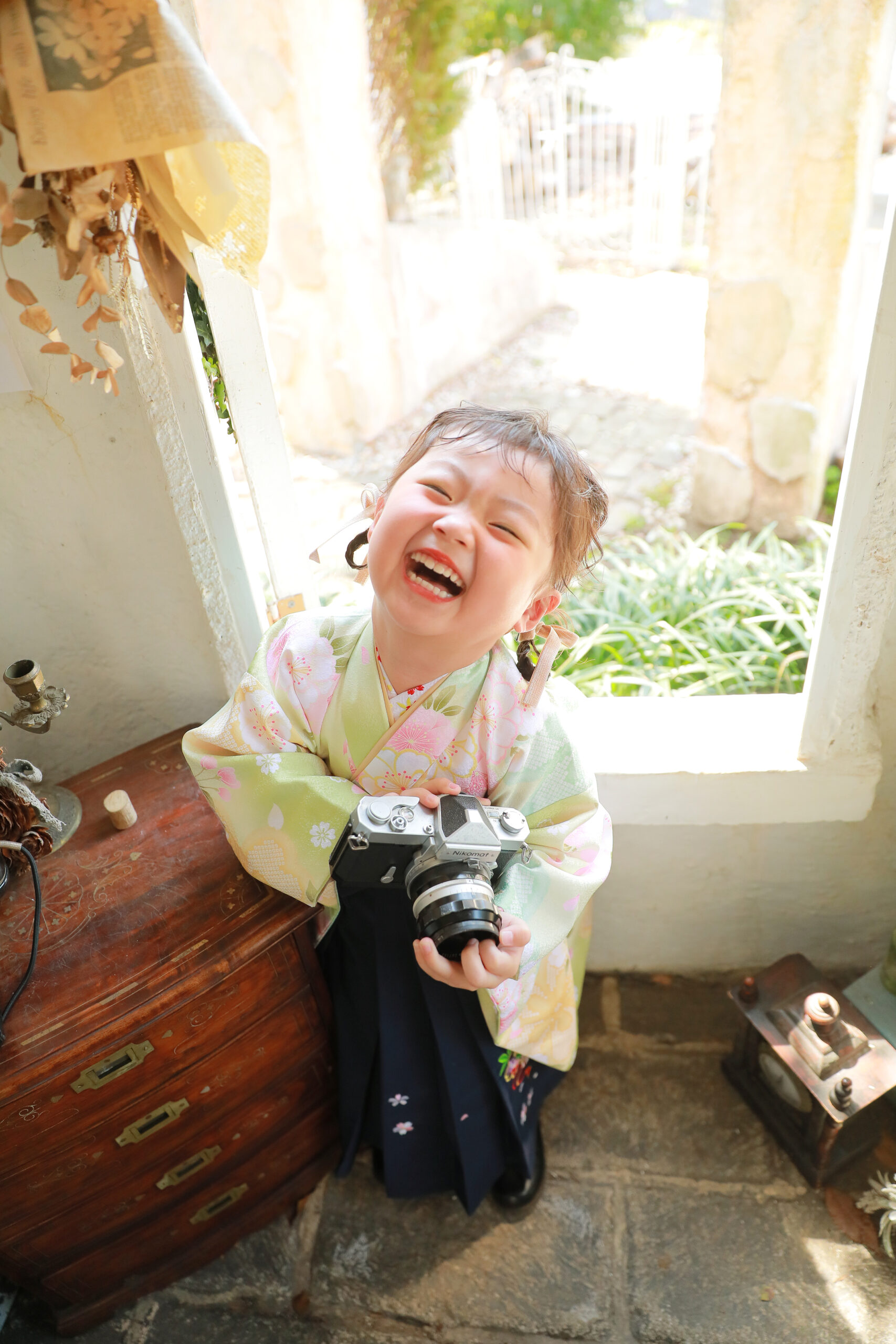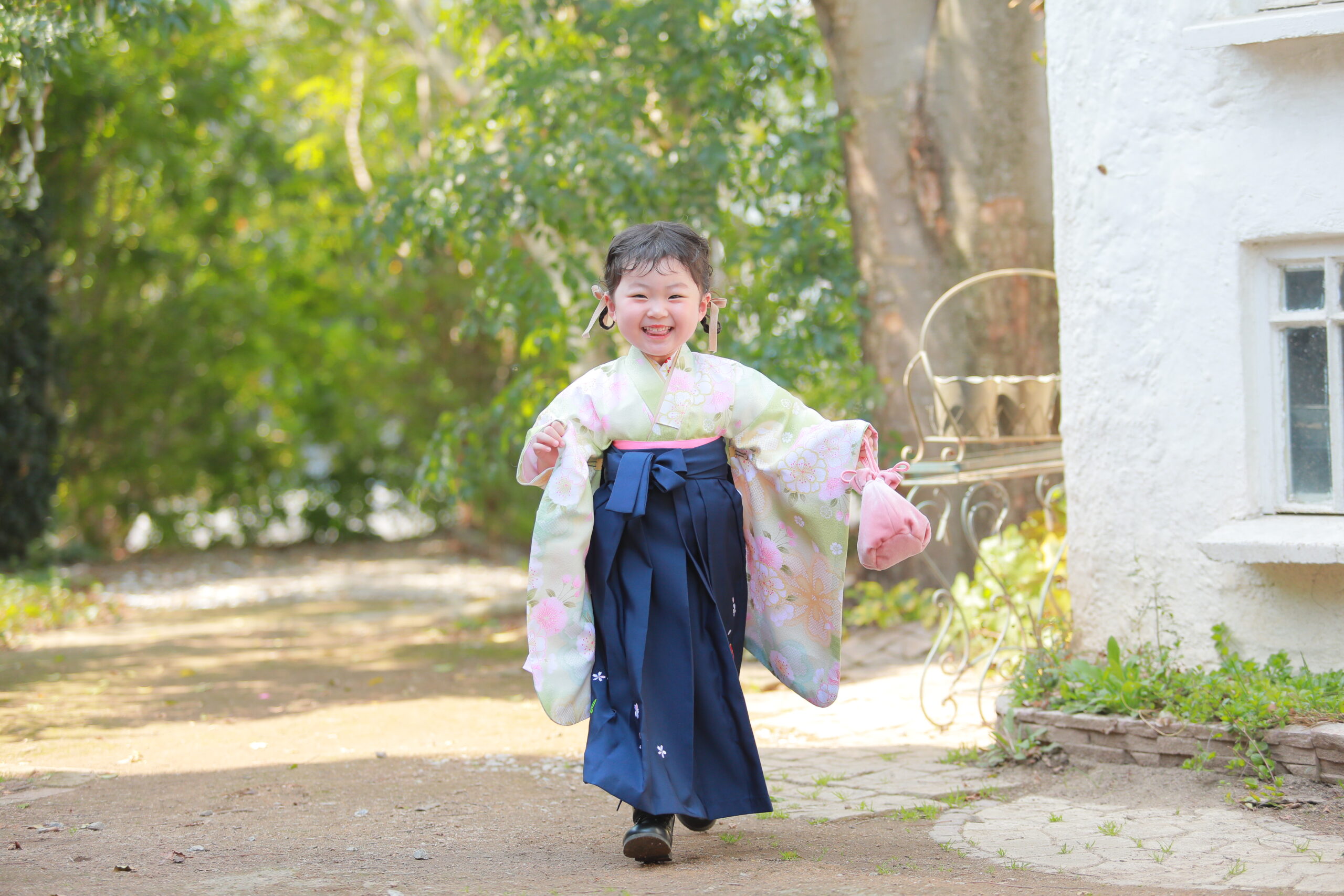 黄緑のやわらかいお着物に青の袴を合わせました!
